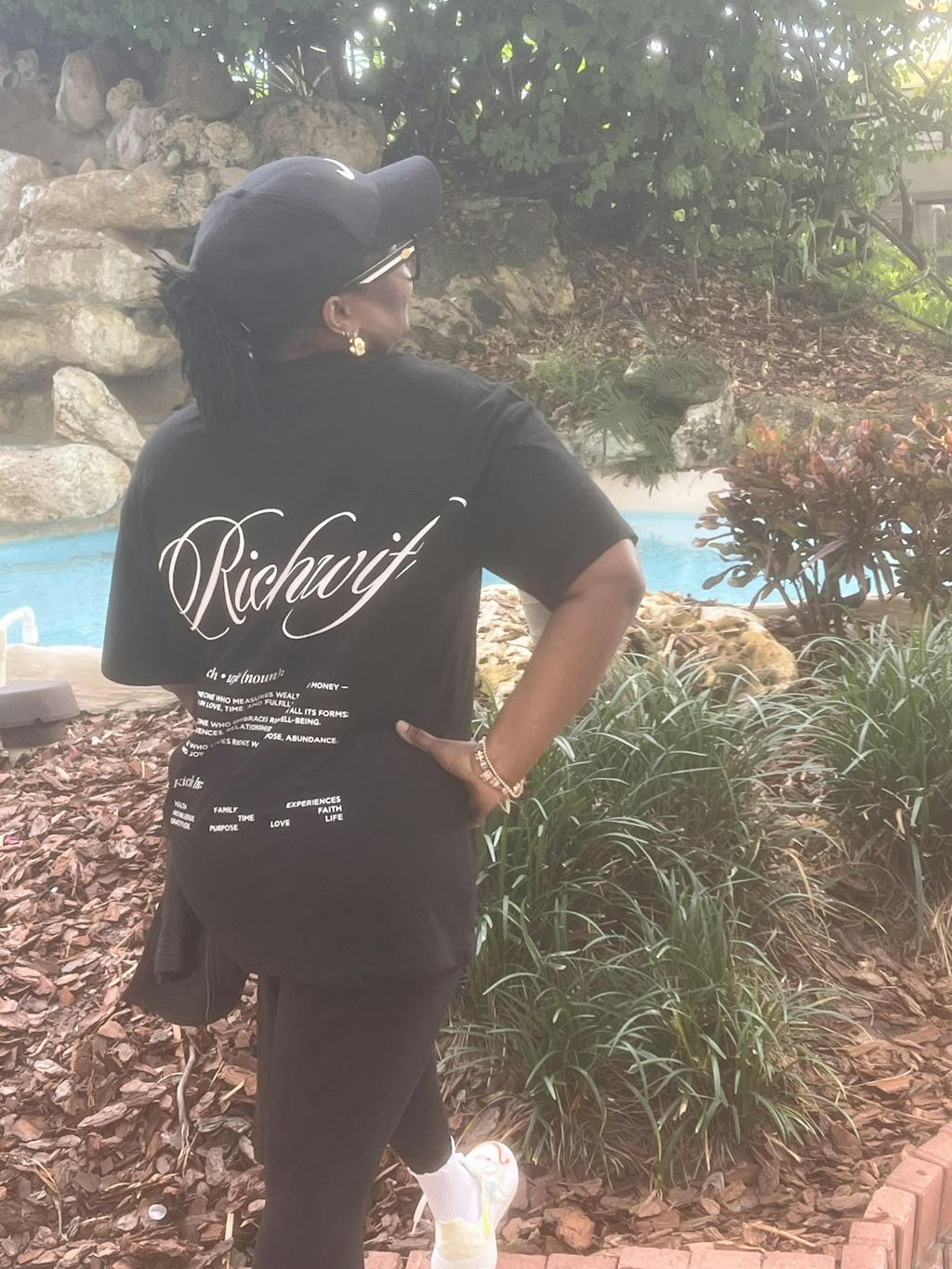 Classic comfort meets everyday inspiration. This oversized t-shirt showcases the RICHWIFE logo on the front chest and a “Richwife” definition design on the back, letting you carry a little motivation wherever you go. With its relaxed fit and soft fabric, it’s perfect for running errands, lounging, or dressing up with layers, making it a versatile staple for your wardrobe.