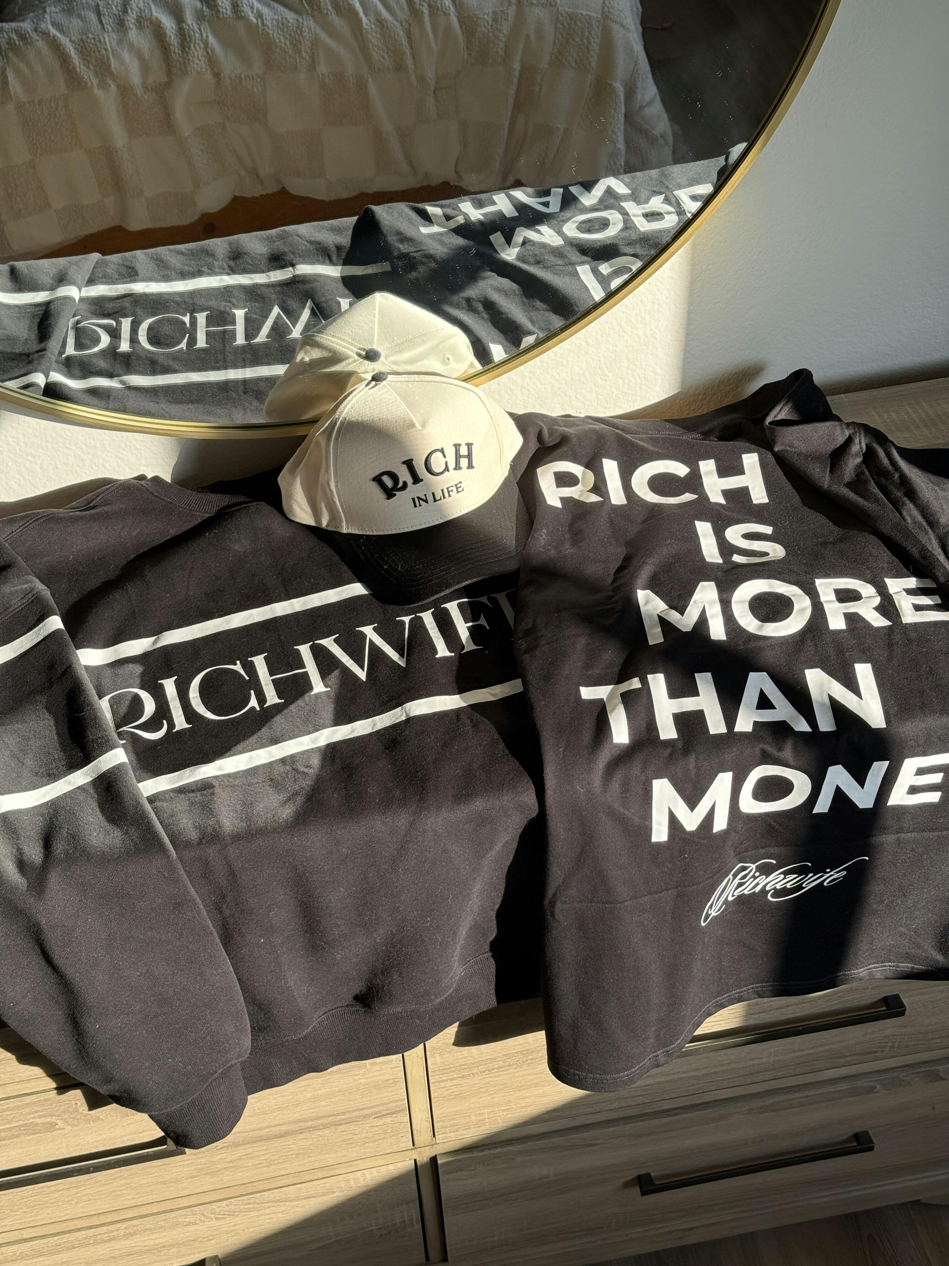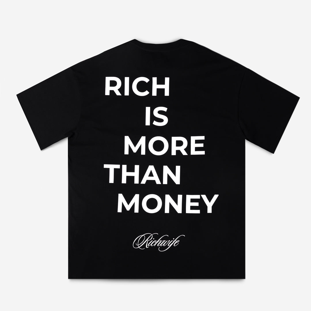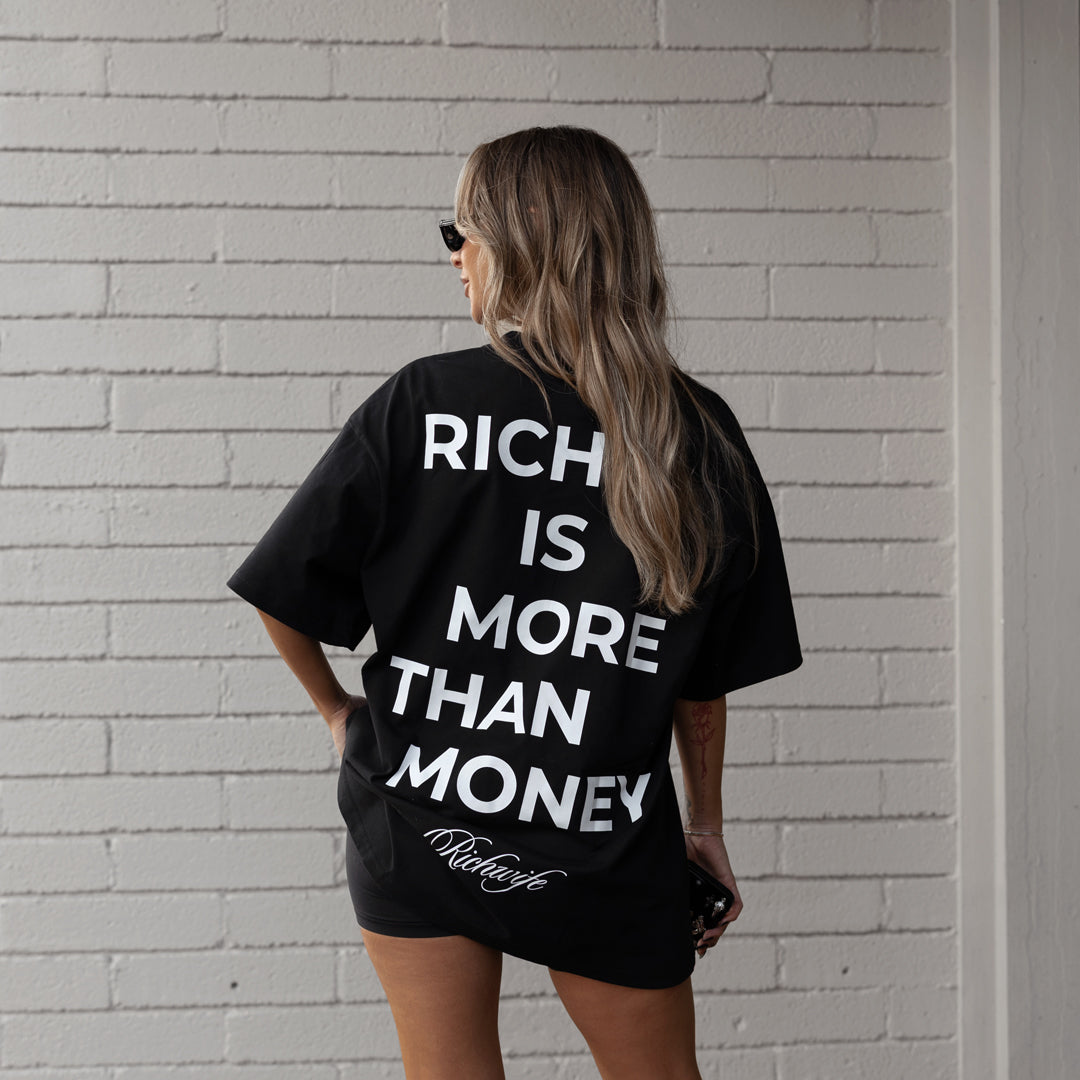 A statement piece that’s as comfortable as it is meaningful. This oversized tee features the subtle RICHWIFE logo on the front chest and a bold “RICH IS MORE THAN MONEY” design on the back, perfect for showing off exactly what Richwife stands for: redefining the meaning of "Rich." Soft, breathable fabric and a relaxed fit make it ideal for lounging, layering, or pairing with your favorite jeans—a daily reminder that richness comes in many forms.