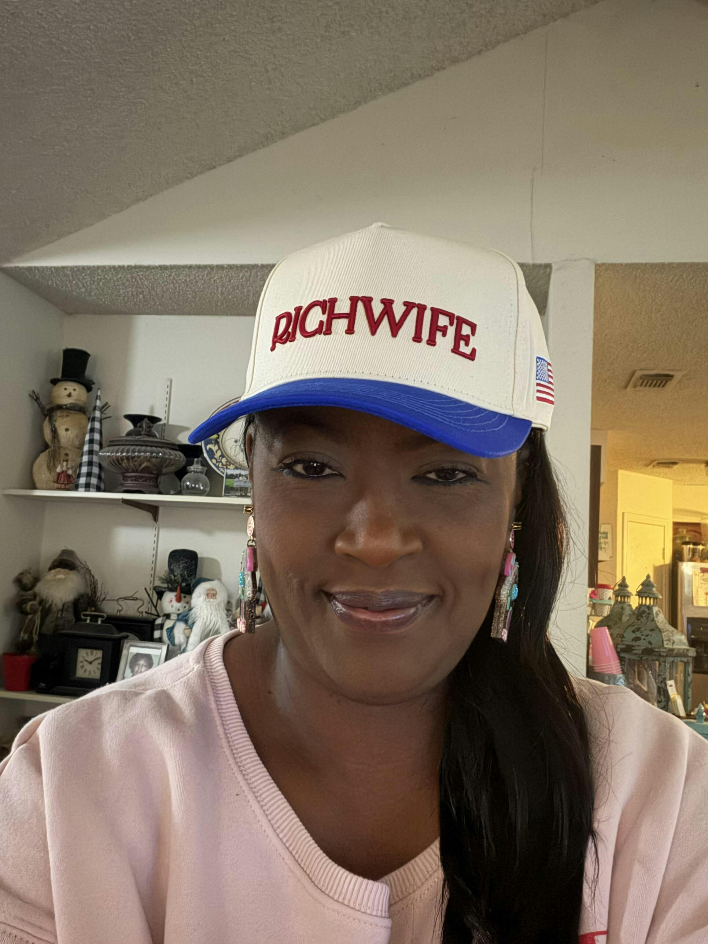 Introducing our Richwife Snapback Hat, a blend of classic design and modern flair. The colored bill perfectly complements the creamy backdrop, while the striking embroidered RICHWIFE logo adds a bold touch of luxury. Crafted for durability and comfort, this hat features an adjustable snapback closure for a personalized fit. Elevate your style with our signature accessory, perfect for any occasion.