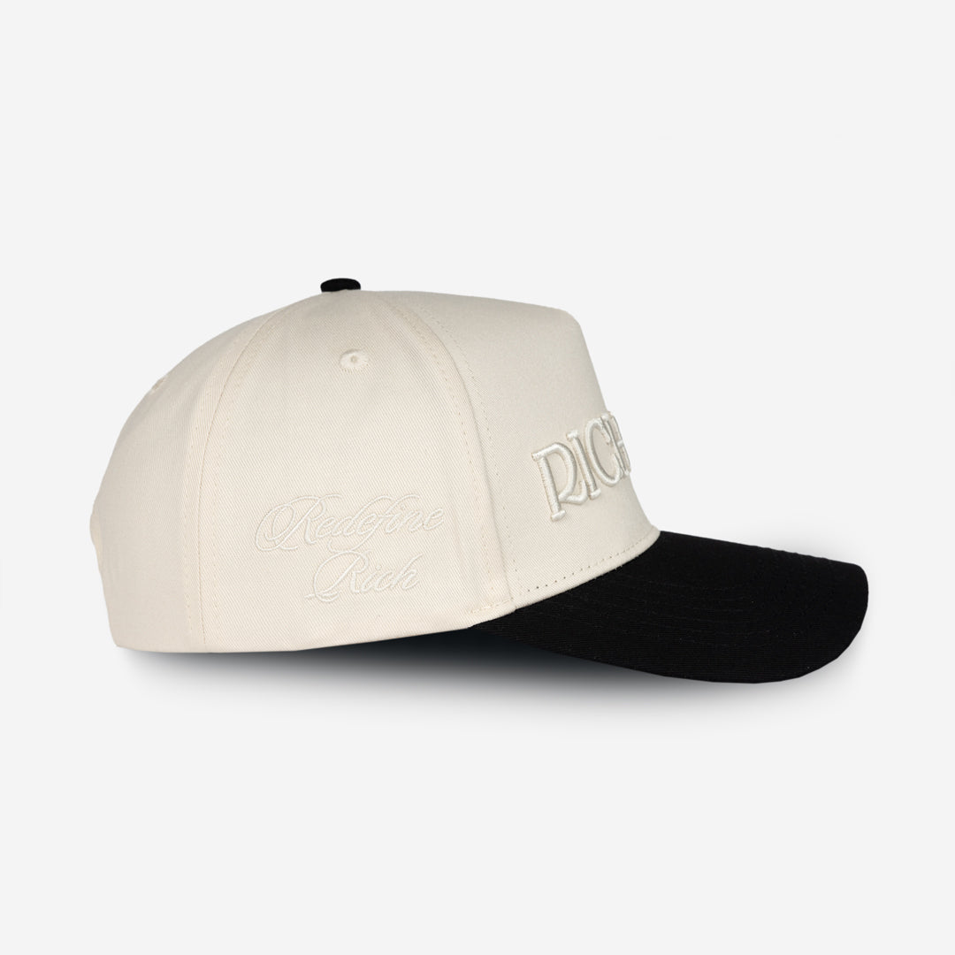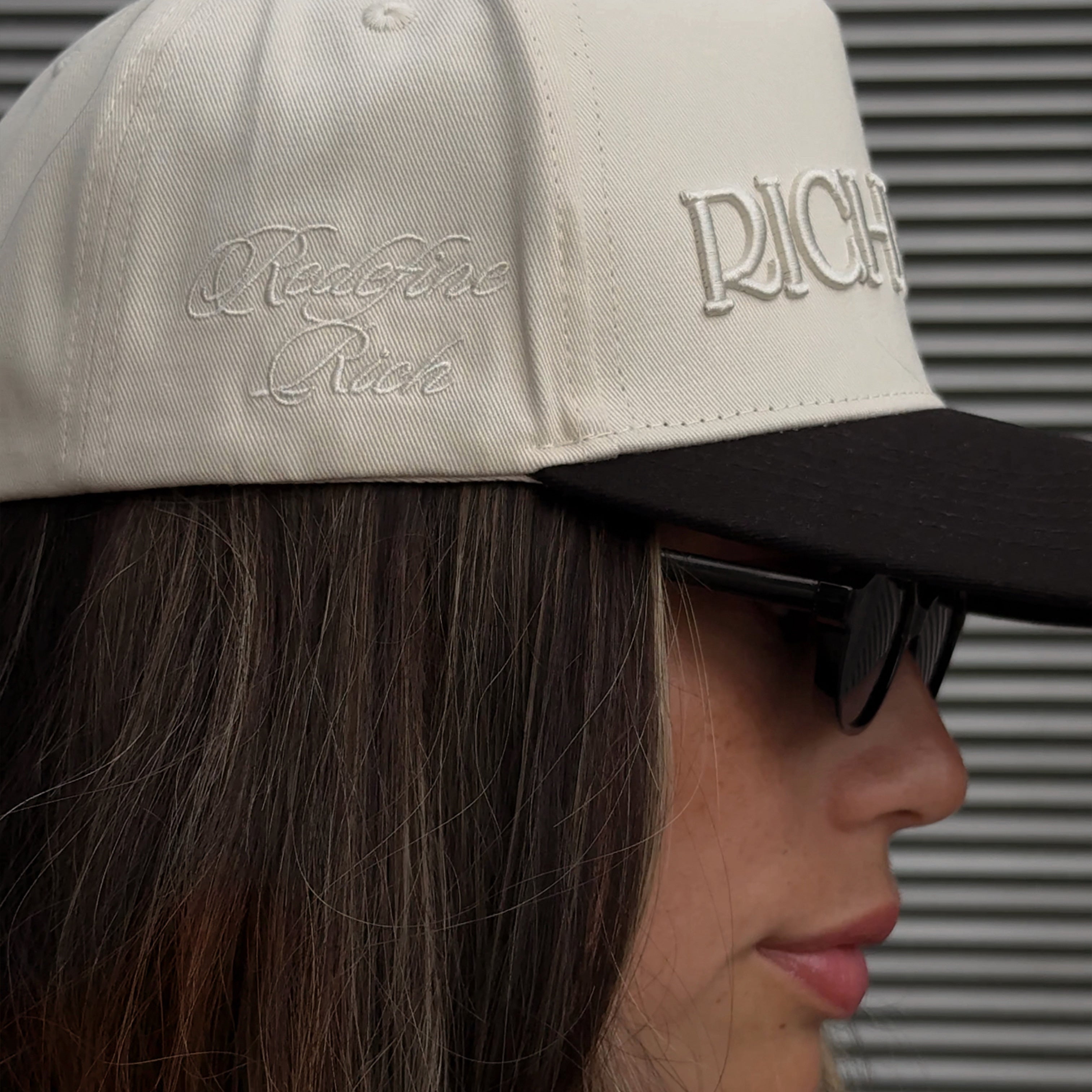 Introducing our Monochrome Richwife™ Cream & Black Hat. Featuring tonal cream embroidery against a cream base, this hat offers a softer, more subtle expression of what it means to be rich.