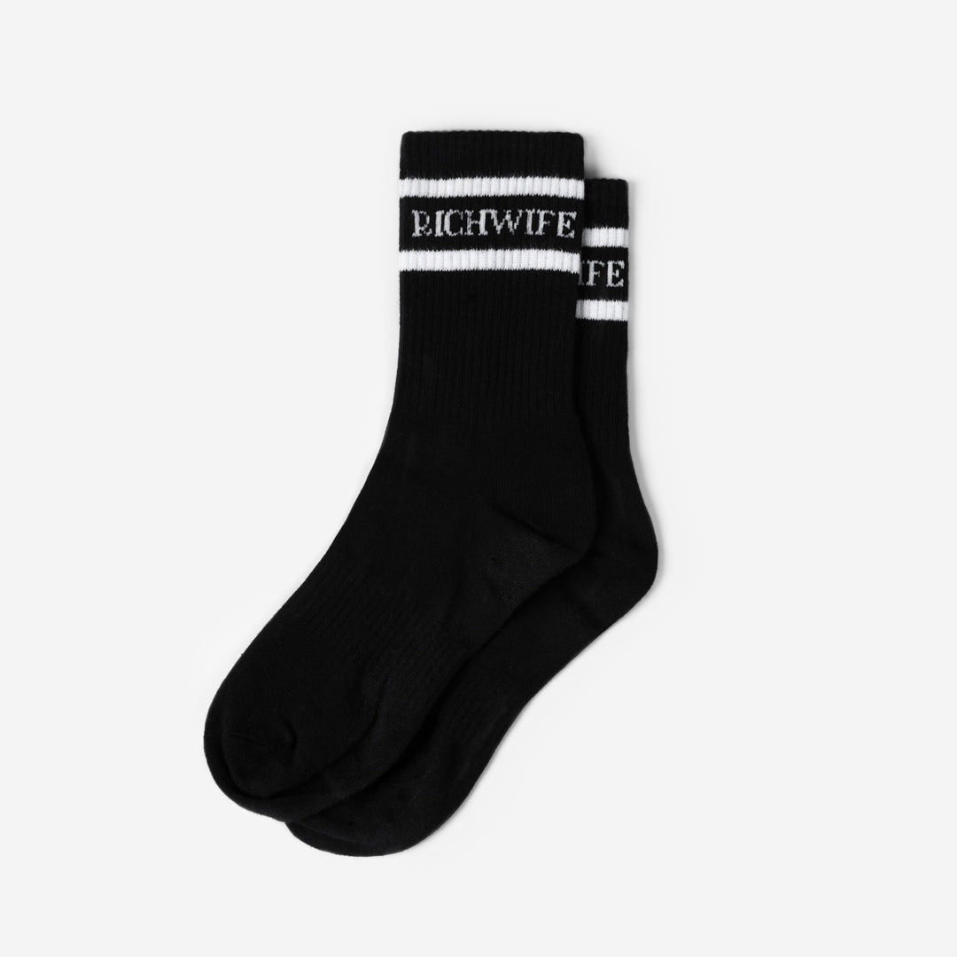 A classic with a statement twist. These black crew socks feature a knit-in RICHWIFE logo and subtle stripe detailing — the perfect balance of timeless and bold. Made for everyday wear, they pair effortlessly with sneakers, loafers, or a relaxed off-duty look.