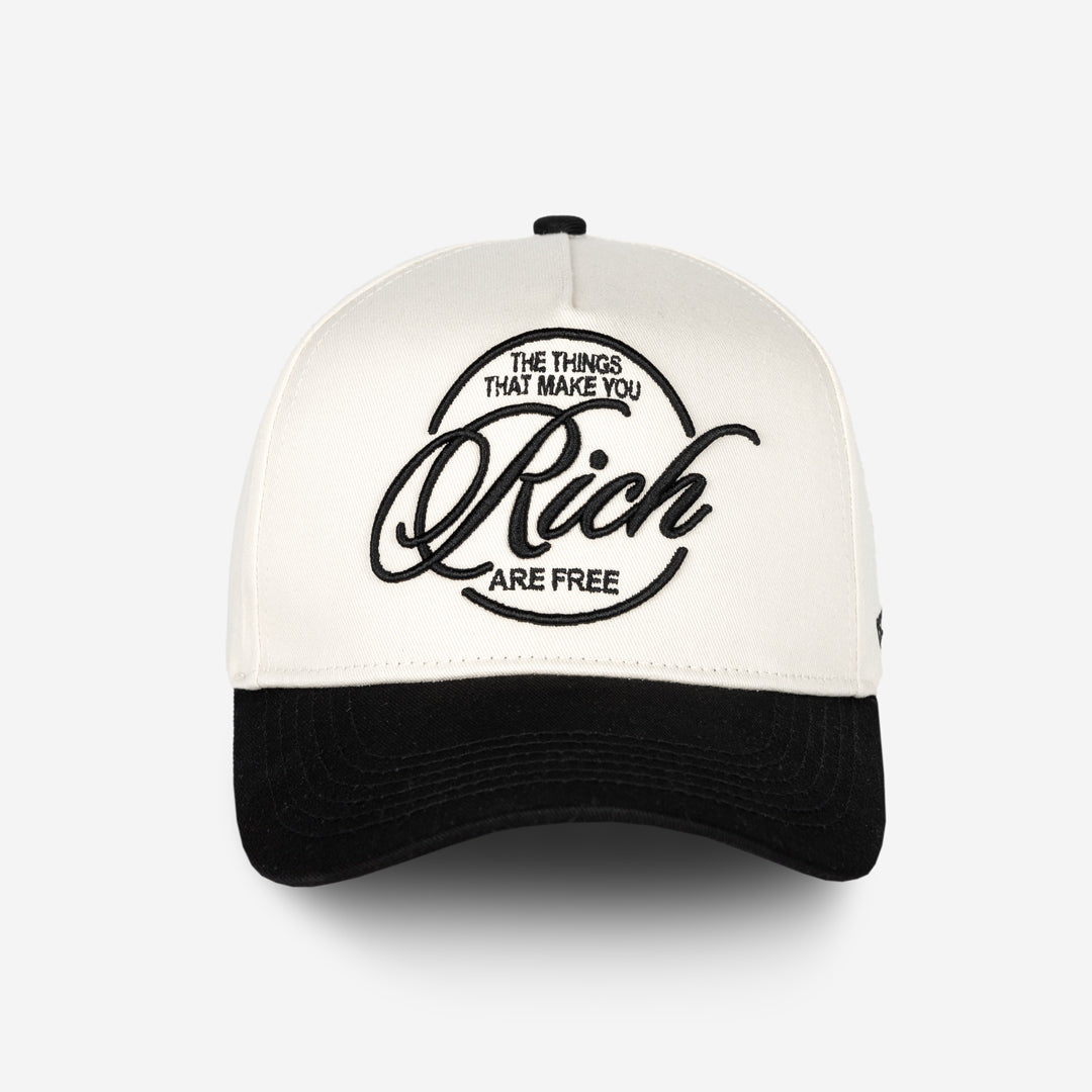 This Cream and Black Snapback Hat features the phrase that defines the heart of our brand: “The things that make you rich are free.” Because true richness isn’t just about wealth — it’s about love, time, health, faith, joy, and the people you share it all with.