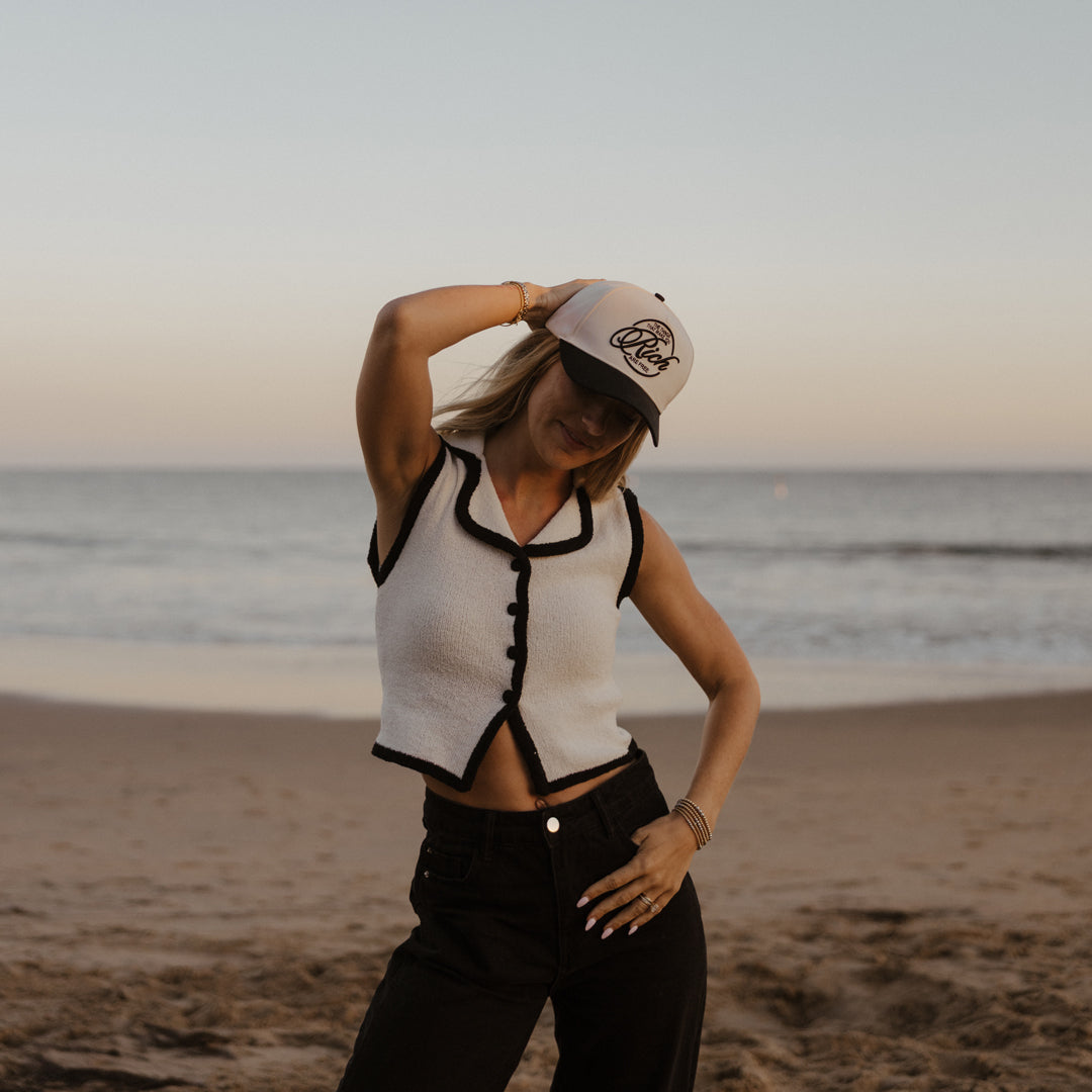 Crafted with the same timeless contrast as our signature cap, the black bill and creamy backdrop create an effortlessly elevated look. Designed for durability and comfort, it features an adjustable snapback closure for a personalized fit — perfect for any occasion.