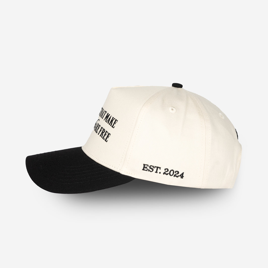 Crafted with the same timeless contrast as our signature cap, the black bill and creamy backdrop create an effortlessly elevated look. Designed for durability and comfort, it features an adjustable snapback closure for a personalized fit — perfect for any occasion.
